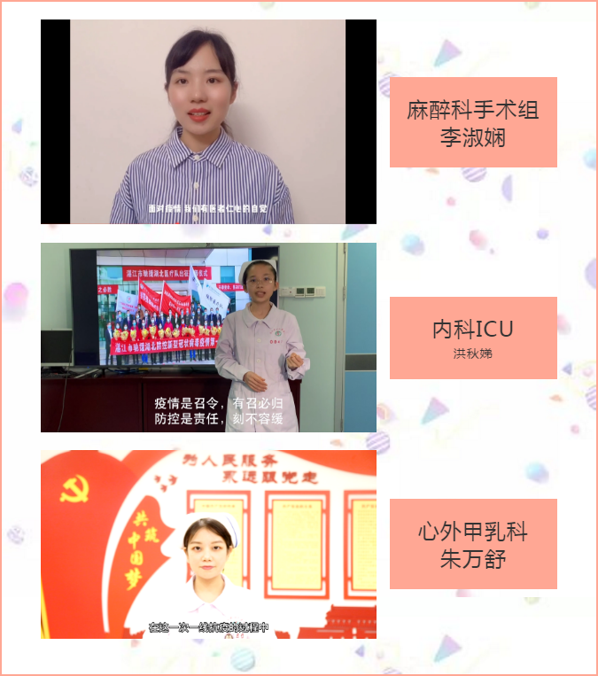 二、举办“只争朝夕,不负韶华”抗疫主题微演讲比赛。展现抗“疫”期间涌现的感人故事、感动瞬间,歌颂最美“逆行者”,充分反映我院护理人员在抗击新冠肺炎战斗中扶危渡厄、无畏逆行的精神。共有6名选手脱颖而出,来看看他们的风采吧: