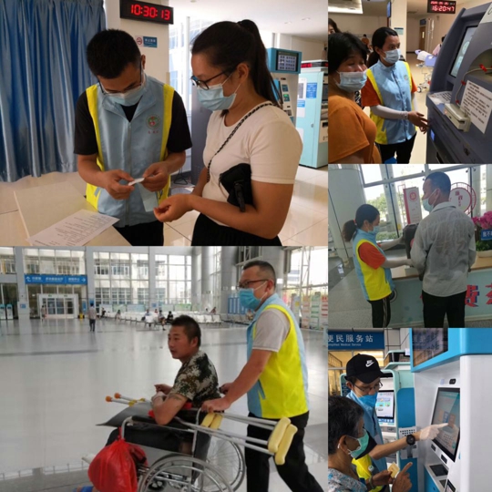 志愿者在提供就医咨询、轮椅帮助、自助机使用、免费茶水、检验结果打印等服务