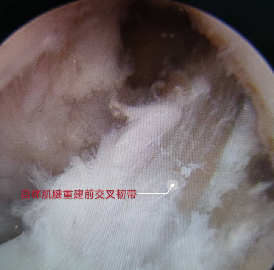 ▲取自体腘绳肌腱重建前交叉韧带,镜下见重建韧带走行张力良好