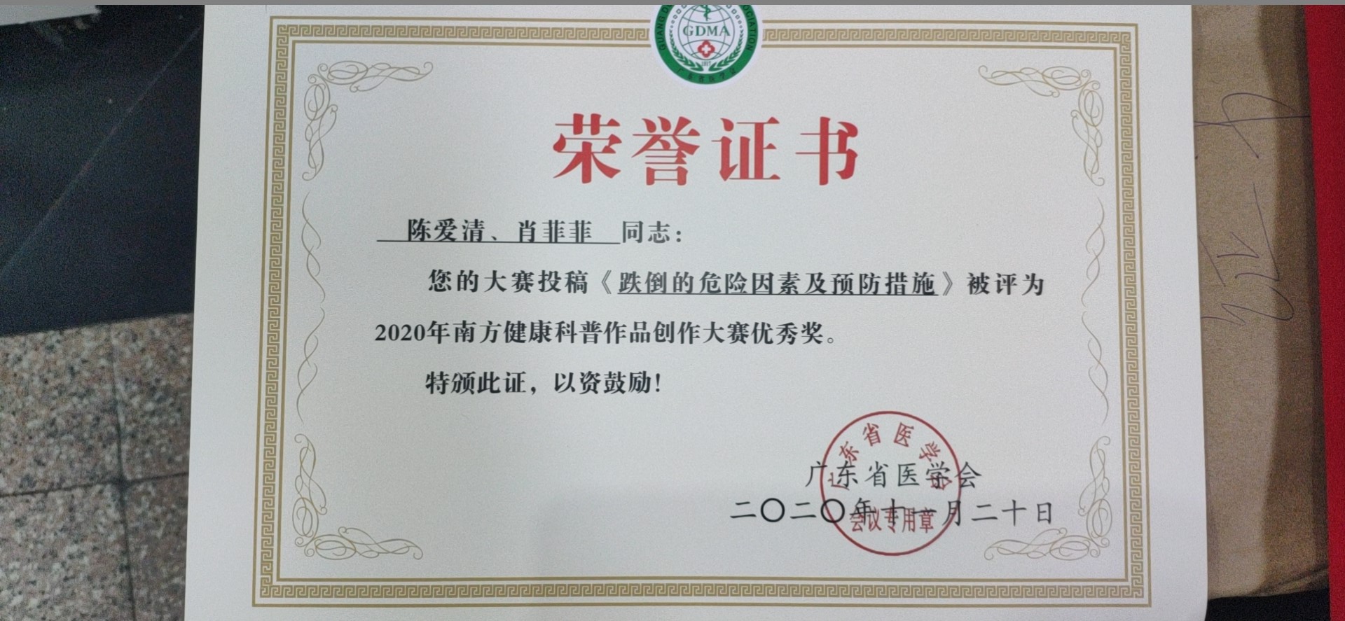 大会期间还举行了2020年南方健康科普大赛颁奖仪式,并评选出广东省医学会健康传播自媒体联盟年度十大公众号。我院及医院综合服务中心被定为广东省医学会健康传播自媒体联盟成员。陈爱清、黄勍、陈妃妹、林佳婷、肖菲菲的作品《卒中健康管理—免费筛查和干预》和陈爱清、肖菲菲的作品《跌倒的危险因素及预防措施》获创作大赛优秀奖。