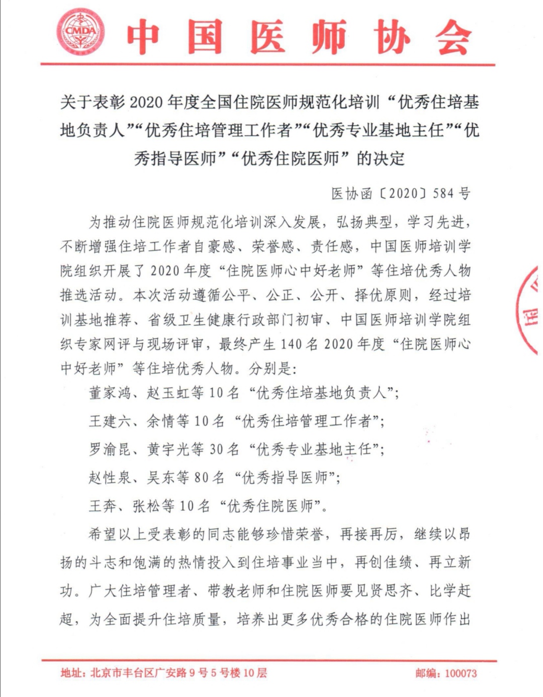 2020年10月31日,由中国医师协会主办的2020年全国住院医师规范化培训高峰论坛在北京召开。大会对本年度全国住培工作突出的个人进行表彰,我院王磊老师荣获“2020年度全国住院医师规范化培训‘优秀指导医师’”,是粤西地区唯一获此殊荣的医师,也是目前全国住院医师规范化培训带教老师个人荣誉认可度最高的奖项。