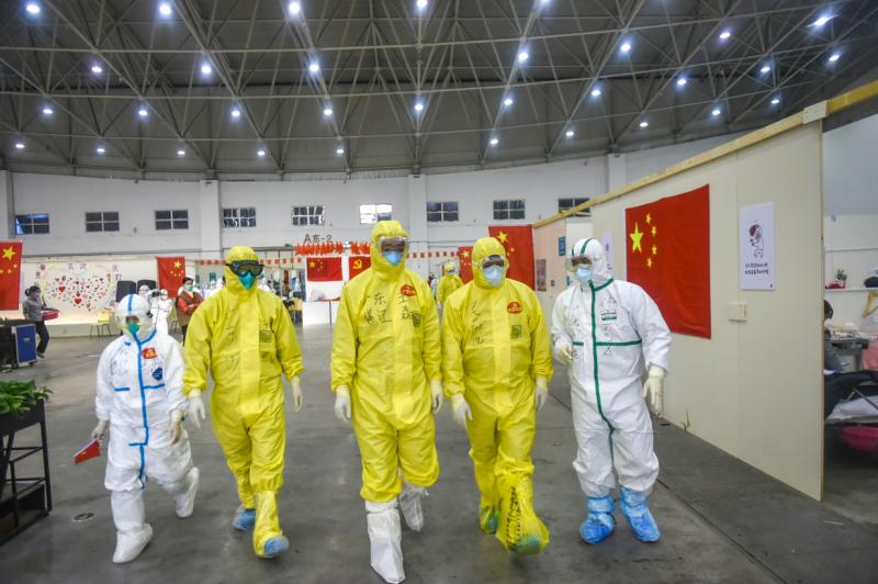 ▲王磊老师在武汉东湖方舱医院查房(左三)