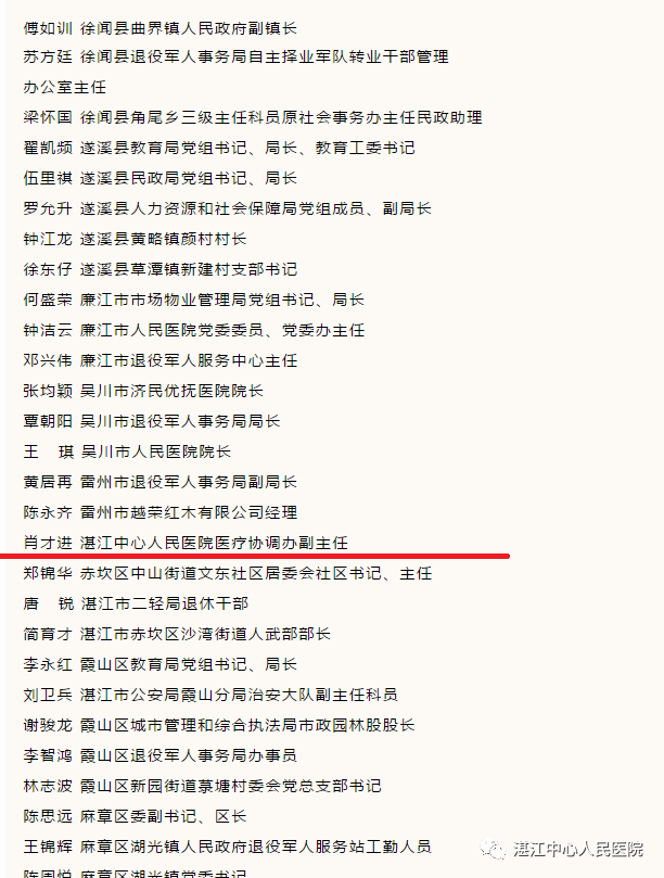 近日,经推荐评选,我院被湛江市委、市政府和湛江军分区评为湛江市爱国拥军模范单位,医疗协调办副主任肖才进同志被评为湛江市爱国拥军模范个人。