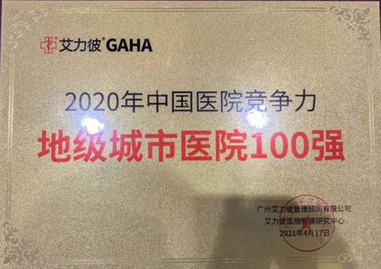 4月17日,由艾力彼医院管理研究中心(以下简称“艾力彼”)主办的《2021中国医院竞争力大会》在厦门举行,大会正式发布“2020地级城市医院竞争力排行榜”等多个榜单,我院以排名第67名的成绩,再次进入“地级城市医院100强”, 这是我院第9次上榜此排行榜。