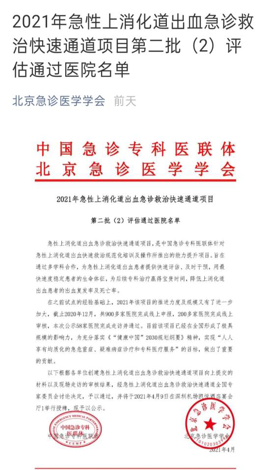 急性上消化道出血急诊救治快速通道项目,是在国家卫健委急诊质控中心的指导下,由中国医师协会急诊医师分会、中国急诊专科医联体主办,旨在提升急性上消化道出血的规范化快速救治能力项目。此项目的推广,主要是通过整合院内医疗资源、融合多学科优势,为危重急性上消化道出血患者提供及时、高效的干预,为患者打通一条顺畅的“绿色生命通道”,以提高急性上消化道出血患者的救治成功率,保障群众的生命安全。