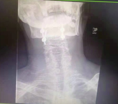 术后X光片,显示寰枢椎脱位已获得解剖复位,椎弓根钉位置良好,寰椎后弓切已除,延髓受压解除