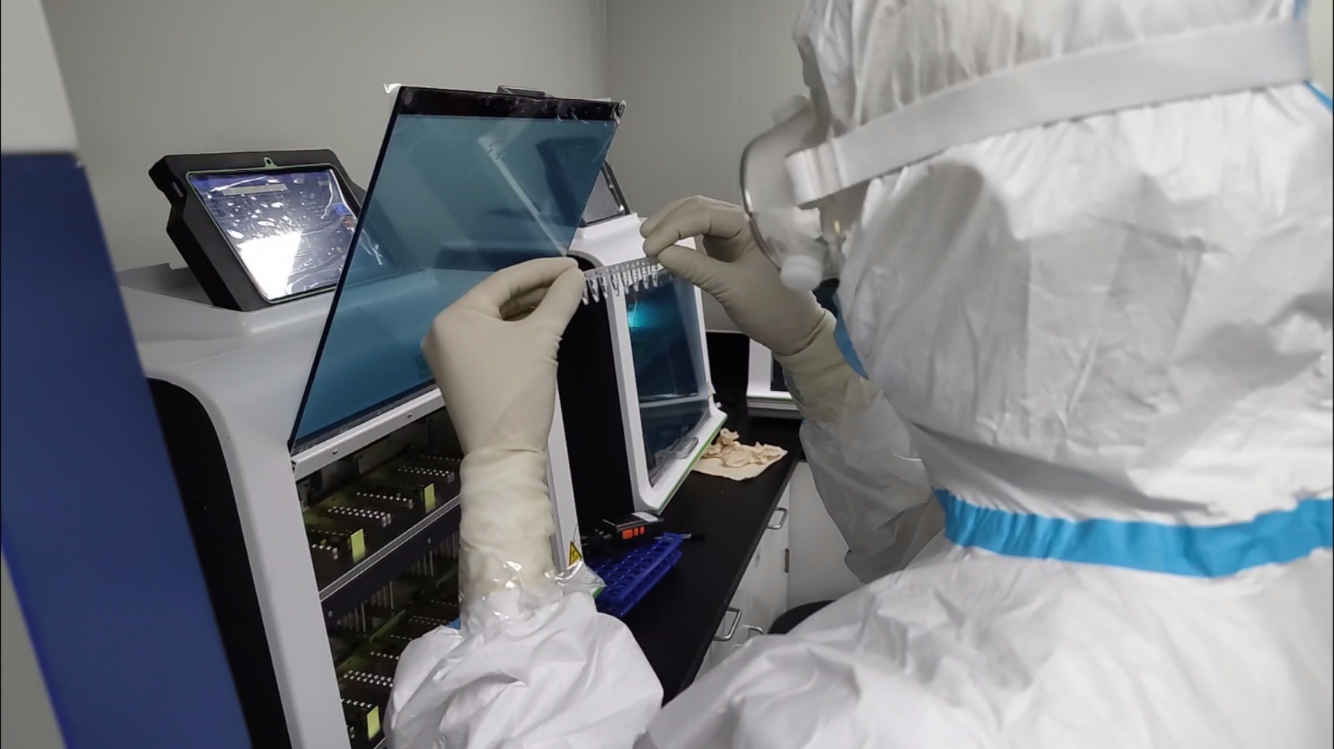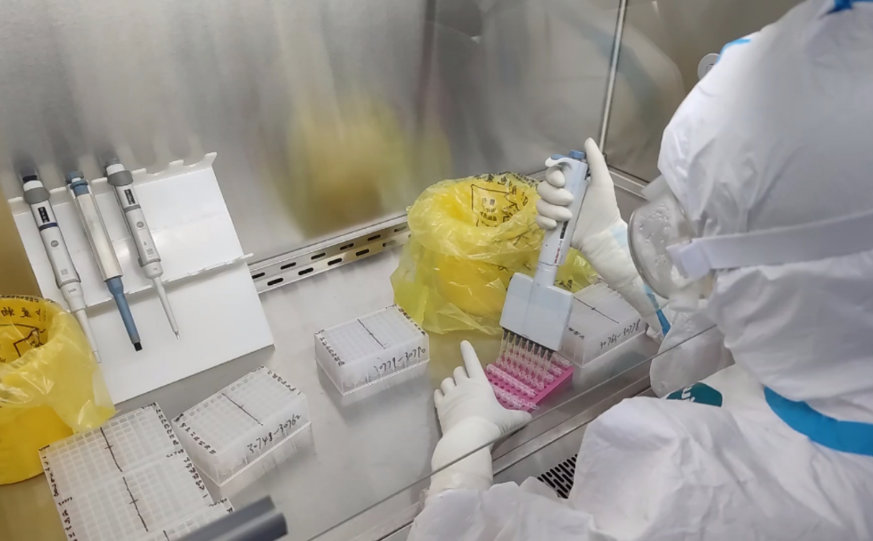 据检验科陈聪主任介绍,咽拭子采样管送到实验室,在得到检测结果前,要经历一套精密而复杂的流程。首先样本抵达实验室后,通过专业信息人员进行扫码登记确认进入检测系统;接着在生物安全柜将采样管放上震荡仪震荡10秒,将附着在拭子上的病毒洗脱在标本保存液中,开盖加样;在采样管中吸取200ul震荡后的标本保存液,加入到提取板里;借助自动化核酸抽提仪器,完成核酸提取,最后将提取的病毒核酸加入到核酸扩增检测试剂中,才能获得配置好的PCR反应体系。检测员将其放置在荧光定量PCR仪上,核酸扩增检测正式开始。陈聪说,这些工作十分繁琐,但要求我们的检测人员非常细致,要用百分百的认真去完成。核酸提取加样时,主操作手至少三小时双手悬空连续操作,且不能轻易离开操作平台。一次新型冠状病毒核酸的检测至少需要经历10道工序。单调而复杂的动作,在酷暑和闷热中,很容易让人产生疲惫感,但科里的每个检验人员都时刻绷紧了心底的那根弦。疫情以来,这种状态已经是检验科的常态,因为所有的人都明白,检验的准确性将对打赢防控这场硬仗起着至关重要的作用。