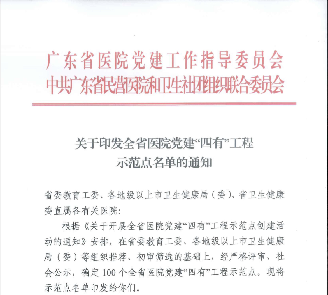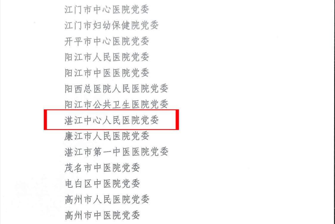 近日,广东省医院党建工作指导委员会、省民营医院和卫生社团组织联合党委公布全省医院党建“四有”工程示范点名单,湛江中心人民医院党委被评为广东省公立医院党建“四有”工程示范点。