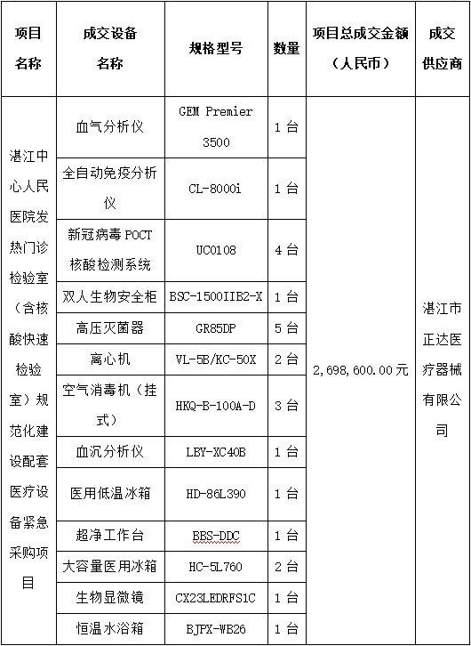 根据广东省新冠肺炎防控指挥办《关于印发进一步落实新冠肺炎医疗救治“四集中”工作方案的通知》(粤防疫指办函〔2021〕336号),明确指定我院为新冠病毒感染者的集中救治医院,并提出集中救治医院需进一步梳理完善和强化落实硬件条件、医疗资源等方面要求。为进一步完善我院新建发热门诊检验室(含核酸快速检验室)规范化建设,我院需紧急采购配套医疗设备,现就采购的成交结果公示如下: