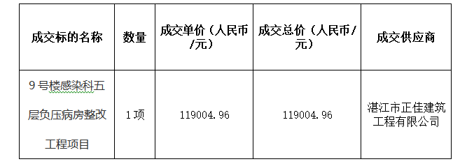因新冠肺炎疫情防控工作的需要,我院需紧急采购9号楼感染科五层负压病房整改工程项目,现就采购的成交结果公示如下: