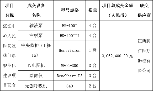 根据广东省新冠肺炎防控指挥办《关于印发进一步落实新冠肺炎医疗救治“四集中”工作方案的通知》(粤防疫指办函〔2021〕336号),明确指定我院为新冠病毒感染者的集中救治医院,并提出集中救治医院需进一步梳理完善和强化落实硬件条件、医疗资源等方面要求。为进一步完善我院新建发热门诊规范化建设,我院需紧急采购配套医疗设备,现就采购的成交结果公示如下: