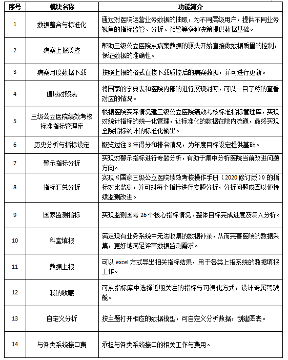 围绕《国家三级公立医院绩效考核操作手册(2020修订版)》的评审指标需求,采购的三级公立医院绩效考核指标监测与分析系统包含以下模块内容: