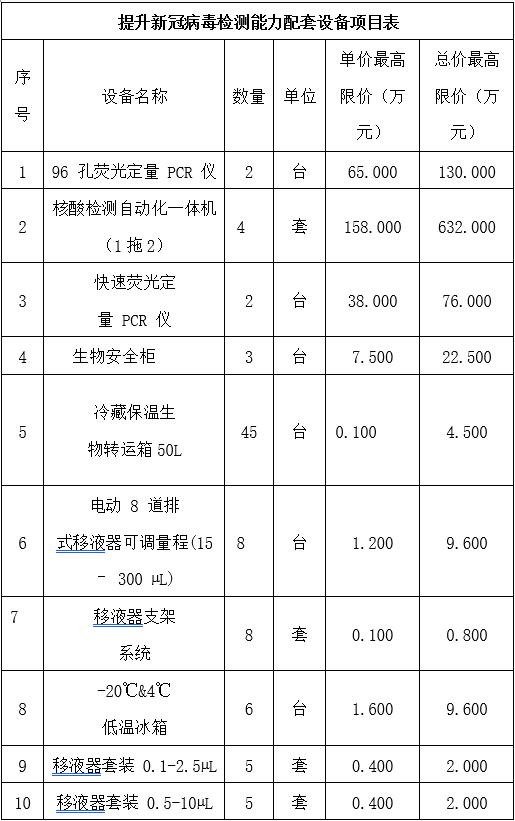 根据《湛江市进一步提升新冠病毒核酸检测能力建设工作方案的通知》(湛防疫指办〔2021〕24 号)、《关于下达粤东粤西粤北地区新冠病毒检测能力提升项目省级补助资金的通知》(湛财社〔2021〕131号)、《粤东粤西粤北建设省公共检测实验室进一步提升新冠病毒检测能力工作方案(2)》等文件要求,我院必须在今年12月底前完成现有单日单管最大检测能力10000管提升到单日单管最大检测能力达到20000管的任务。