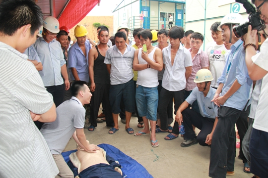 当日下午4时,义诊活动在新院建筑工地工人宿舍区开展,吸引许多工人前来候诊。医疗志愿者们有的耐心地为工人看病和解答疑问;有的为工人测量血压;有的发放常见病和多发病的健康处方。特别值得一提的是,急救中心的志愿者不顾天气炎热,跪在地上认真为工人们示范讲解在病人心脏骤停后如何进行心肺复苏的方法,还传授身体受伤后的应急处理办法。