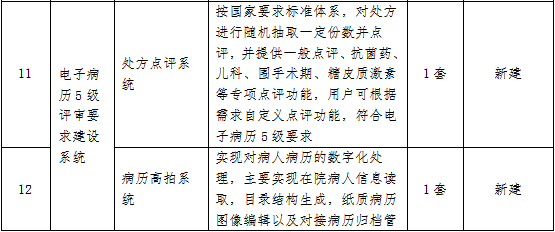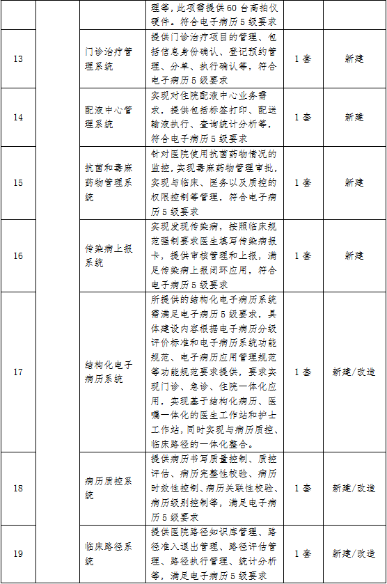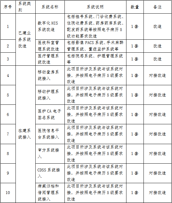 此次电子病历5级评审升级改造建设项目包括:电子病历系统、门诊住院医生工作站、护士工作站、病历质控、临床路径、抗菌和毒麻药物管理、传染病上报等系统建设,按照电子病历5级评审要求提供处方点评系统、配液中心管理系统、门诊治疗管理系统、病历高拍系统及输血管理系统等。对医院HIS系统、LIS、PACS、院感系统、手术麻醉系统和重症监护系统等根据电子病历5级评审相关的系统按标准要求改造,实现闭环管理,同时通过事前、事中、事后的业务流程改造,提高医疗安全,保障医疗质量,确保我院能通过电子病历5级评审。