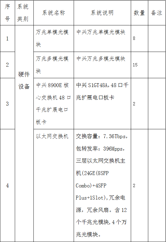 目前数据中心核心交换机急需扩展:8个中兴万兆单模光模块; 15个中兴万兆多模光模块; 2块48口千兆扩展电口板卡; 同时等保安全设备上线需要增加:2台以太网交换机配置12个千兆单模模块和4个万兆多模模块。