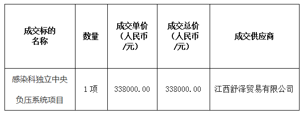 因新型冠状病毒感染的肺炎疫情防控工作的需要,我院需紧急采购一项工程动力科关于感染科独立中央负压系统项目,现将洽谈采购结果公示如下: