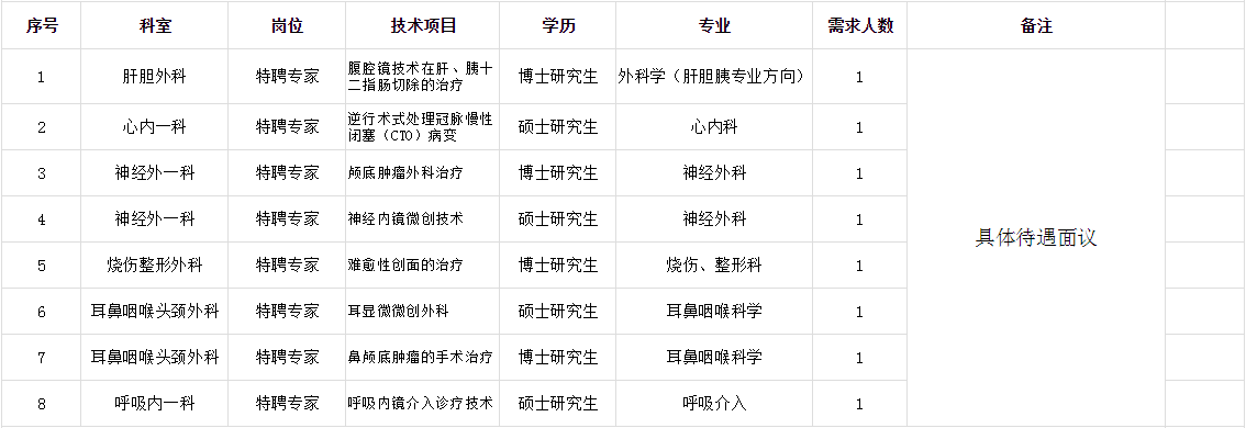 由于业务大幅提升,发展前沿医疗技术,促进医院临床专科建设,需引进相关技术项目的特聘专家,具体招聘信息如下: