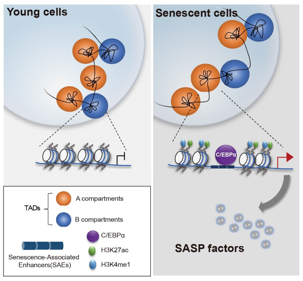 2020年11月7日,湛江市临床医学研究所管仪婷博士联合北京大学生物信息中心和首都医科大学人脑保护高精尖创新中心团队,在Nucleic Acids Research杂志在线发表了题为“Senescence-activated enhancer landscape orchestrates the senescence-associated secretory phenotype in murine fibroblasts”的研究论文。该研究以细胞复制性衰老为研究对象,重点探究了染色质在衰老过程中的空间变化规律,并阐释了拓扑结构域TADs结构内部存在的一条由衰老活跃增强子介导的、通过招募转录因子C/EBPα促进下游SASP基因表达的新型作用机制。