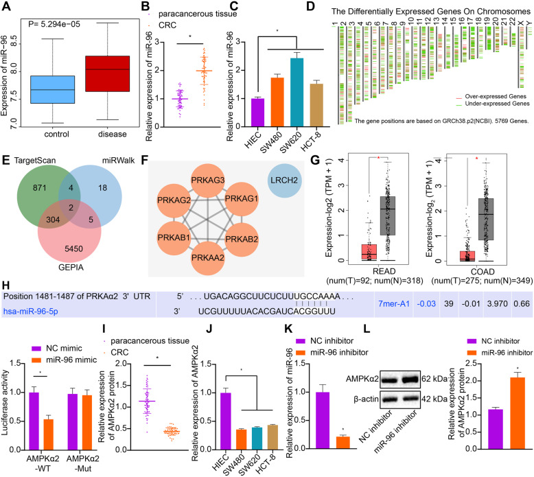 Fig 1. miR-96 targets and downregulates the expression of AMPKα2 in CRC.