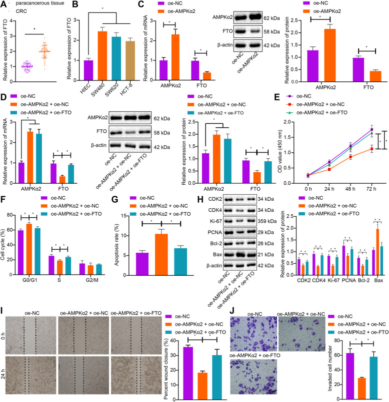 Fig 2. AMPKα2 inhibits CRC cell proliferation, migration, and invasion and induces apoptosis by inhibiting FTO.