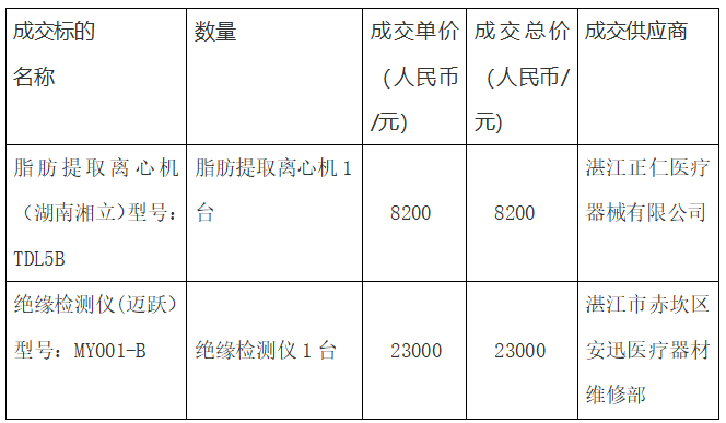 通过设备科论证医疗美容科购买的脂肪提取离心机于2023年11月21日在医院官网发布【中心医器械采95号】采购信息,有三家公司(湛江市千信医疗科技有限公司、湛江正仁医疗器械有限公司、广州定嘉医疗器械有限公司)报名响应,根据采购流程于2023年12月1日组织相关人员洽谈竞价,与会人员一致认为,湛江正仁医疗器械有限公司价格脂肪提取离心机参数服务均符合使用科室要求。绝缘检测仪于2023年11月13日在医院官网发布【中心医器械采92号】和2023年11月27日在医院官网重新发布【中心医器械采99号】采购信息,有八家公司(广州安知与医疗器械有限公司、、广西熠嘉贸易有限公司、江西葵锦医疗器械有限公司、广东汇文医疗科技有限公司、广州市祈康医疗器械有限公司、湛江市赤坎区安迅医疗器材维修部、珠海市华耀医疗器械有限公司、广州市祺济医疗科技有限公司)报名响应,根据采购流程于2023年12月6日组织相关人员洽谈竞价,与会人员一致认为,湛江市赤坎区安迅医疗器材维修部提供的绝缘检测仪价格参数服务更符合使用科室要求,现将洽谈采购结果公示如下: