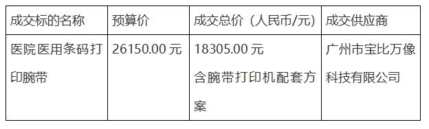 根据医院工作要求,我院需购买医用条码打印腕带一批。我院于2024年1月10日发布湛江中心人民医院医用条码打印腕带采购信息,共有湛江齐嘉贸易有限公司、上井感光科技(苏州)有限公司、广州福天智能信息有限公司、广州市宝比万像科技有限公司、安徽祥人医用材料有限公司、广州爱德医疗科技有限公司6家公司报名响应。按照采购流程,湛江中心人民医院于2024年1月18日组织召开了采购洽谈会,根据洽谈情况,结合项目需求,与会人员综合考虑后一致认为广州市宝比万像科技有限公司经营部资质、方案符合项目需求,现就采购结果公示如下: