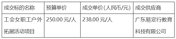 结合我院工会女职工开展户外拓展活动的工作需要。我院于2024年6月4日发布湛江中心人民医院工会女职工户外拓展活动项目采购信息,共有湛江市盛学文化传播有限公司、雷州市茂德公国际旅行社有限公司、广东易定行教育科技有限公司3家公司报名响应。按照采购流程,湛江中心人民医院于2024年6月12日组织召开了采购洽谈会,根据洽谈情况,结合项目需求,与会人员综合考虑后一致认为广东易定行教育科技有限公司的活动方案符合项目需求,现就采购结果公示如下: