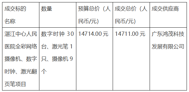 根据医院工作需要,我院于2024年7月23日发布湛江中心人民医院全彩网络摄像机、数字时钟、激光翻页笔项目采购信息,最终有湛江精安科技有限公司、广东鸿茂科技发展有限公司、广东怡盛信息技术有限公司3家报名响应。按照采购流程,湛江中心人民医院于2024年8月19日组织召开了采购洽谈会,与会人员就中标结果达成一致,现就采购结果公示如下: