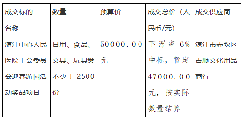 根据工作需要,工会拟采购迎春游园活动奖品一批,我院于2025年1月10日发布湛江中心人民医院工会委员会迎春游园活动奖品项目遴选信息,共有湛江市赤坎区吉顺文化用品商行、湛江市赤坎区湛叶文化用品经营部、湛江市赤坎区超强文化用品经营部3家公司报名响应。按照遴选流程,湛江中心人民医院于2025年1月17日组织召开了遴选洽谈会,根据洽谈情况,结合项目需求,与会人员综合考虑后一致认为湛江市赤坎区吉顺文化用品商行资质、报价符合项目需求,现就遴选结果公示如下: