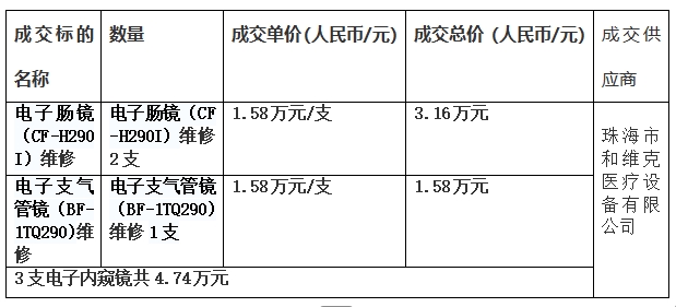 通过设备科论证内镜诊疗科需购买电子肠镜(CF-H290I)、电子支气管镜(BF-1TQ290)等维修项目,分别于2025年5月8日和2025年5月22日在医院官网发布湛中心医器械采【2025】41号和湛中心医器械采【2025】48号采购信息,只有一家公司(珠海市和维克医疗设备有限公司)报名响应,根据采购流程2025年6月10日组织相关人员开会洽谈竞价,与会人员一致认为,珠海市和维克医疗设备有限公司提供的电子肠镜(CF-H290I)、电子支气管镜(BF-1TQ290)等维修服务、技术参数符合使用科室要求,现将洽谈采购结果公示如下: