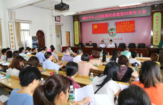 党委书记、副院长陈志辉代表党委作了讲话。他首先回顾了中国共产党从诞生到取得新民主主义革命胜利、从新中国诞生到改革开放以及党的十八大以来所取得的举世瞩目的伟大成就。接着,回顾了在中国共产党的正确领导下,我院从小到大的76年发展之路。目前,我院的开放床位增长到了1600张,医疗业务每年都以两位数比例增长,年门诊量已接近百万人次,年住院病人量达到近5万人次,年手术量达到近3万台次;三大技术平台取得突破性进展,重点扶持项目发展势头很好,为湛江人民的健康作出了应有的贡献。更令人鼓舞的是,我们医院的迁建工作顺利推进,一座充满生机的湛江中心人民医院新院不久将屹立在粤西人民面前!为了满足广大人民群众对健康不断增长的需求,为了打造百姓满意的三甲医院,陈志辉书记对全院党员干部提出了三点要求:一是要精心组织,卓有成效地开展好党的群众路线教育实践活动;二是要加强从严治党,以创建“五型”党组织,不断提升党建的科学化水平;三是要牢记党的宗旨,以迎接“三甲”复审为契机,全面推动医院健康发展。