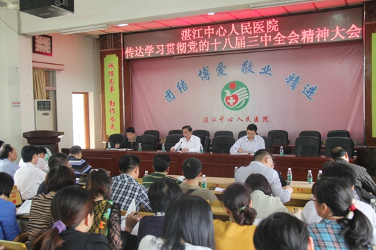 首先,党委书记陈志辉作题为《学习贯彻党的十八届三中全会精神,全力打造百姓放心示范医院》的专题辅导报告。他说,党的十八届三中全会提出了全面深化改革的总目标和改革的重点,是我们一切工作的科学指南和行动纲领。他提出,全院上下要紧密结合医院实际,迅速掀起学习贯彻十八届三中全会精神热潮。要以三中全会精神为指引,以迎接三甲评审为契机,增强医院的整体实力,为广大群众提供更加优质、更高水平的医疗服务;要坚持以病人为中心的原则,改进服务作风和工作作风;要以增进人民福祉为出发点和落脚点,扎实地搞好医院迁建工程建设和新院的“软件”储备工作,尽快为广大患者提供更好的就医环境。