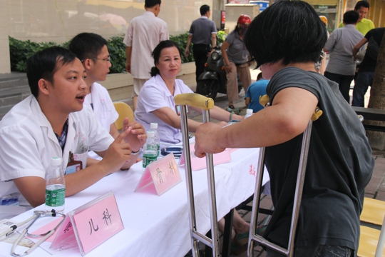 5月18日是第24个全国助残日。 当天上午8时半,我院团委组织内科、外科、儿科、骨科等团员青年志愿者在赤坎跃进路举行义诊活动,免费为残疾人和普通群众提供诊疗、测量血压、健康教育咨询、心理疏导等服务。义诊共接待残疾人和群众150多人次,发放各种健康教育处方等宣传资料100余份(册),受到领导、残疾人朋友以及普通群众的好评。
